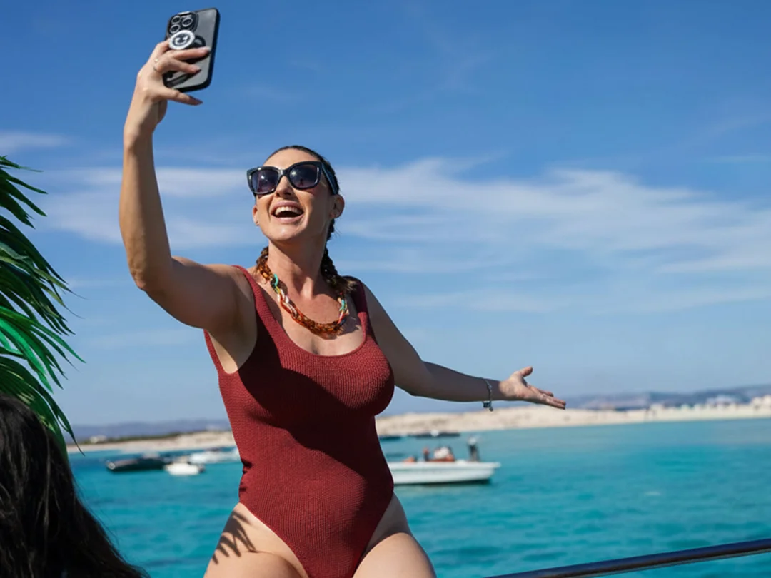 Sail from Playa d’en Bossa, stop for 2 swim breaks, enjoy free time in Formentera, return by ferry