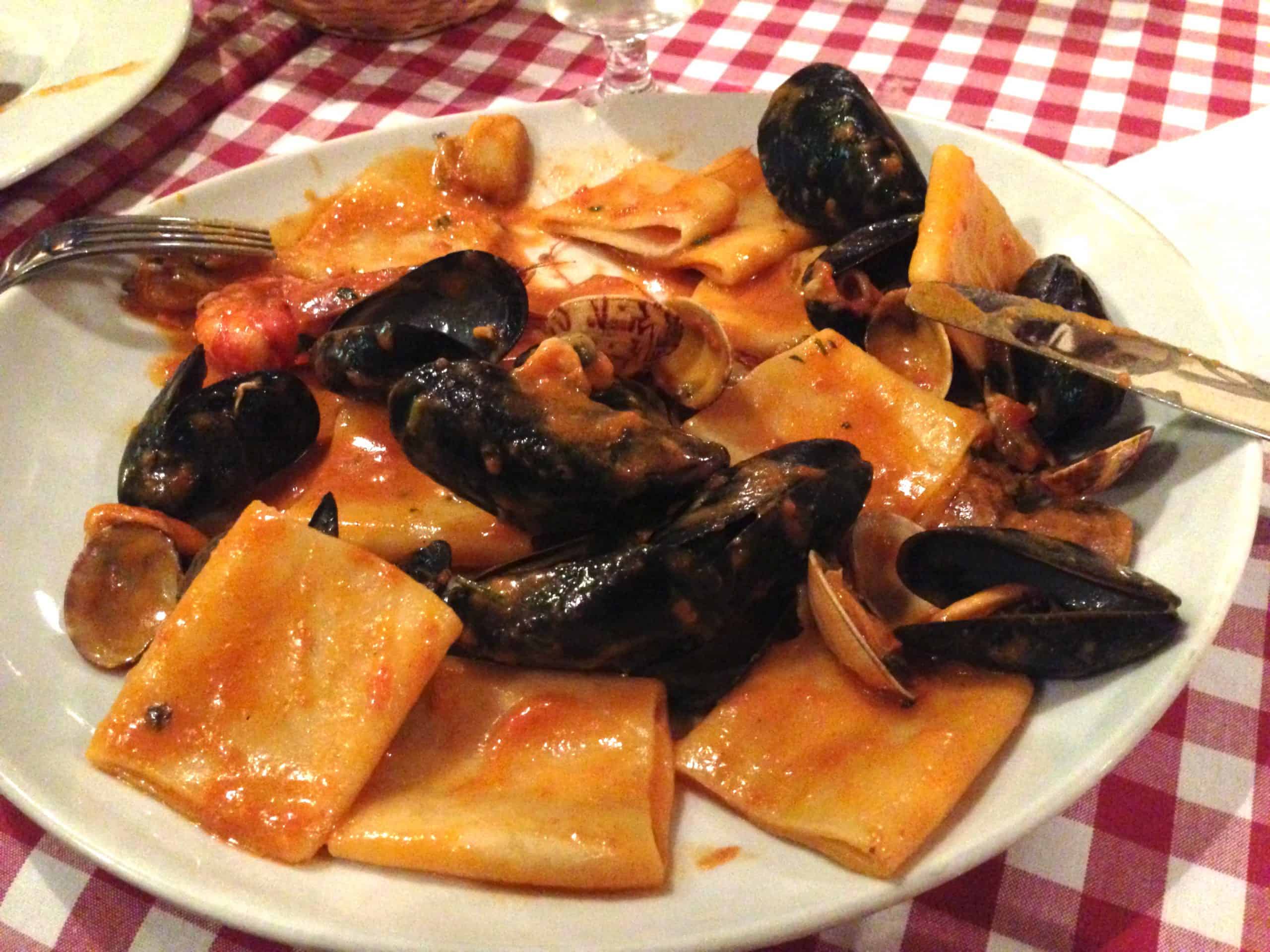Great food comes at a price and I’m not talking about price tags. Expect service to be what I call “Roman”. Don’t ask many questions and be ready to order when they are. Don’t even think about asking to swap out ingredients, but then that is a no-no in all of Italy. When I go here, I eat the Paccheri allo Scoglio. It’s larger than large smooth rigatoni-like pasta with shellfish in a dry red sauce.