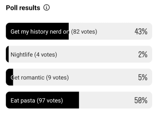 So what do people want to do in Rome the most? We ran a poll on our Instagram @thetourguy and asked that question to over 200 people and here’s what they picked.