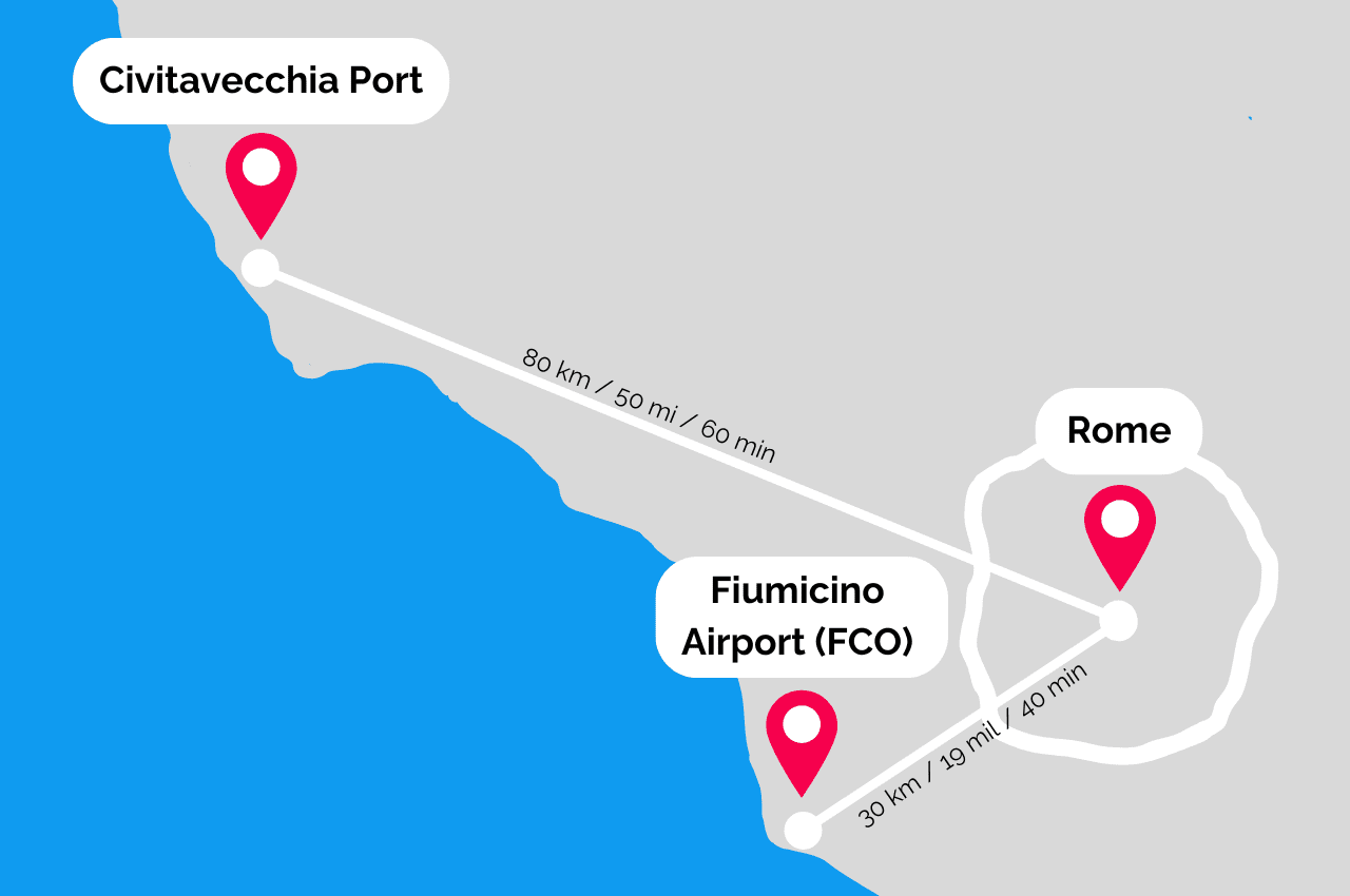 Civitavecchia is the main port for cruise ships arriving in Rome. If you cruise itinerary says “Rome” you’re coming to Civitavecchia. Rome is not a coastal city. It’s about 80 kilometers (50 miles) from the city center and most options take around an hour, so getting to and from Rome requires some planning. Here are your main options: